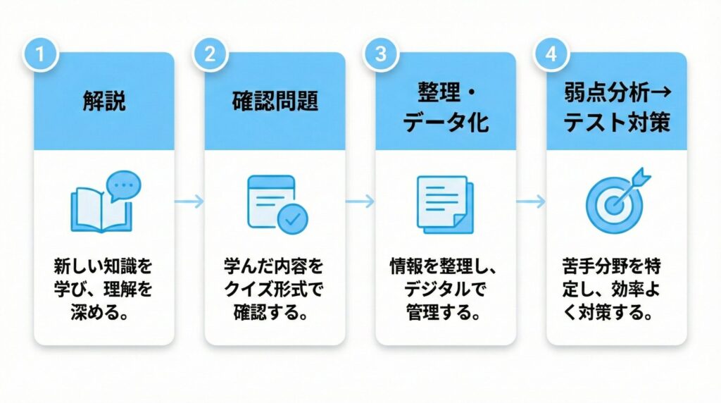 4. 弱点分析→テスト対策(成果に直結) 弱点メモからAIが優先順位を付け、テスト対策(演習)に変換します。
